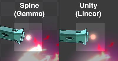 Important Note: It is very important to decide on the color space to be used in your Unity project early on as it has a big impact on how any blending will look. This affects both alpha-blending or semi-transparent parts as well as additive/multiply/screen blending for special effects. Additionally, the used color space dictates how you can export your atlas texture assets from the Spine Editor.